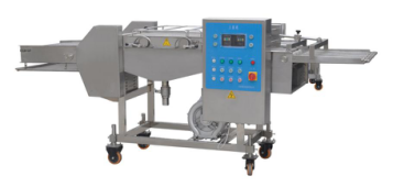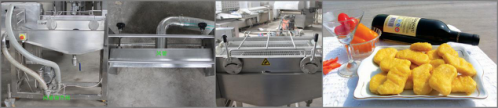 濃漿機是產品經過上下輸送網帶夾持,在漿液中產品粘附面漿。通過風刀時,多余的漿液被吹落。然后輸入到下一工序。產品適合于天婦羅產品。
