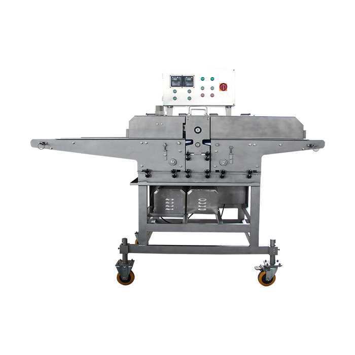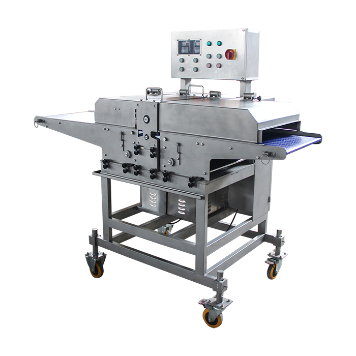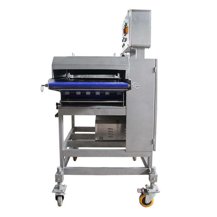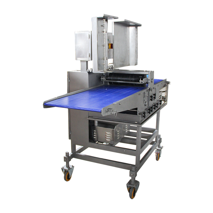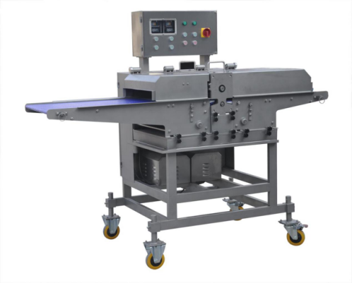 無骨雞柳切條機是通過多組圓盤刀將肉均勻切割成條狀、塊狀等,適用于雞肉、豬肉、牛肉等其他畜、禽肉新鮮或冷凍原料的分切加工??膳c分切機對接成產(chǎn)出尺寸。鮮肉切條機主要加工的產(chǎn)品,雞柳條,排條等產(chǎn)品。