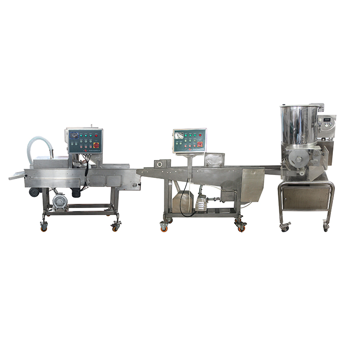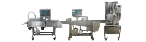 肉餅生產線把混合好的原料經過成型,上漿,上康,油炸,速凍等工藝做出不同厚度不同規格的肉餅。模具可以生產不同形狀的產品(如三角形,橢圓形,卡通雞塊形狀,不規則形狀)通過模具更換產品。肉排生產線適用于肉類、水產、蔬菜、奶酪以及它們混合料。魚餅生產線的需要配置前處理設備和后處理設備:絞肉,混合,油炸包裝等設備,蝦餅生產線與這些配套設備組成一條完整的快餐調理生產線。