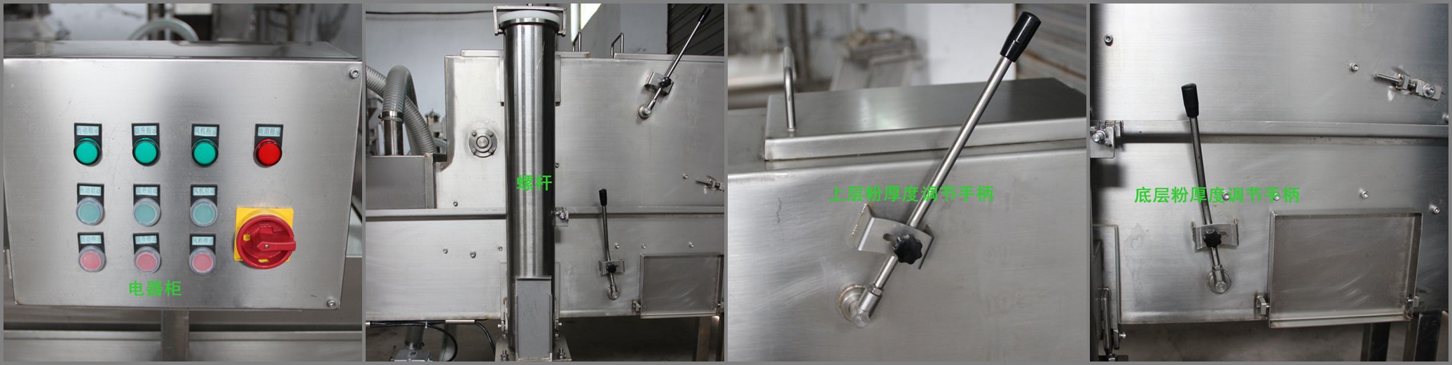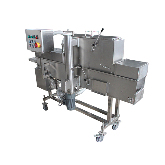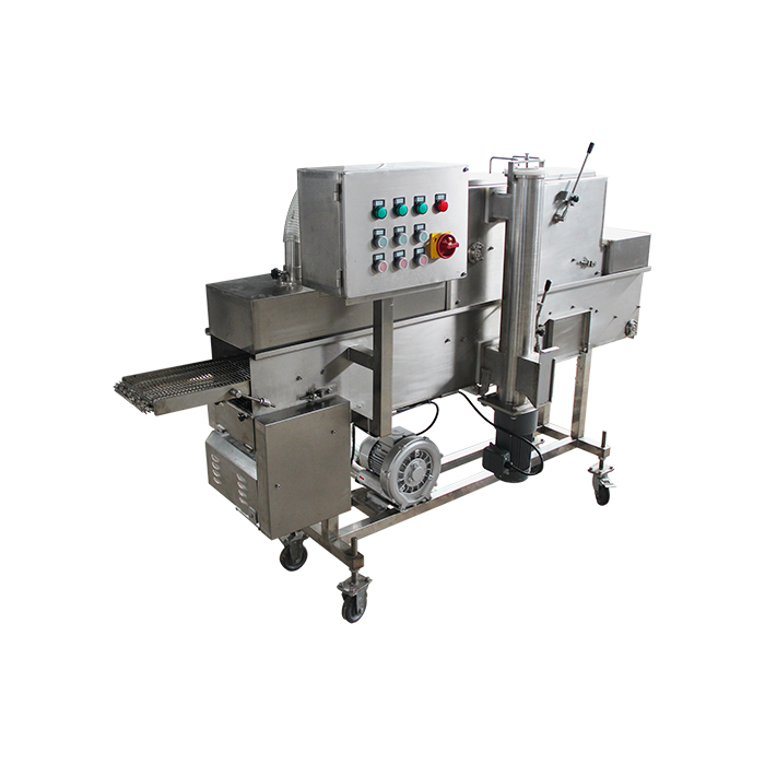 全自動上粉機能自動完成產品的上粉過程,適用于各種預上粉、混合粉等。產品進入下網帶,底部及側面沾滿粉,從上料斗流下的粉將產品上部覆蓋,經壓輥壓緊(上下網帶上的粉厚度可以方便調節),上粉后經過風管,將多余的粉吹落。進入下一道程序。