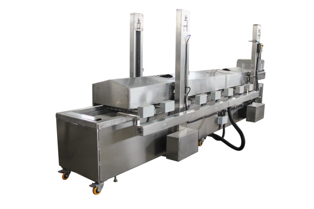 電油炸機(jī)是連續(xù)炸物機(jī),食品從機(jī)體的進(jìn)口端輸入后,隨輸送帶在熱油中通過(guò)時(shí)被油炸熟化,并從機(jī)體的出口端輸出。
